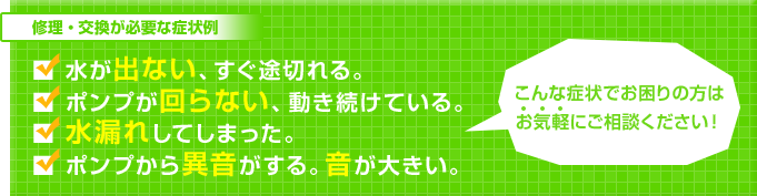 ポンプにトラブルが起きてしまうと生活に多大な影響を及ぼしてしまいます。症状が軽度のうちに早めの対処をしてあげれば古くなっているポンプでもまだまだ使用することは可能です。気になる点、気づいた事などがあれば小さなことでも一度ご相談下さい。不具合の原因を解明し、再発防止のためのアドバイスを差し上げることも可能ですので、まずはご相談ください。